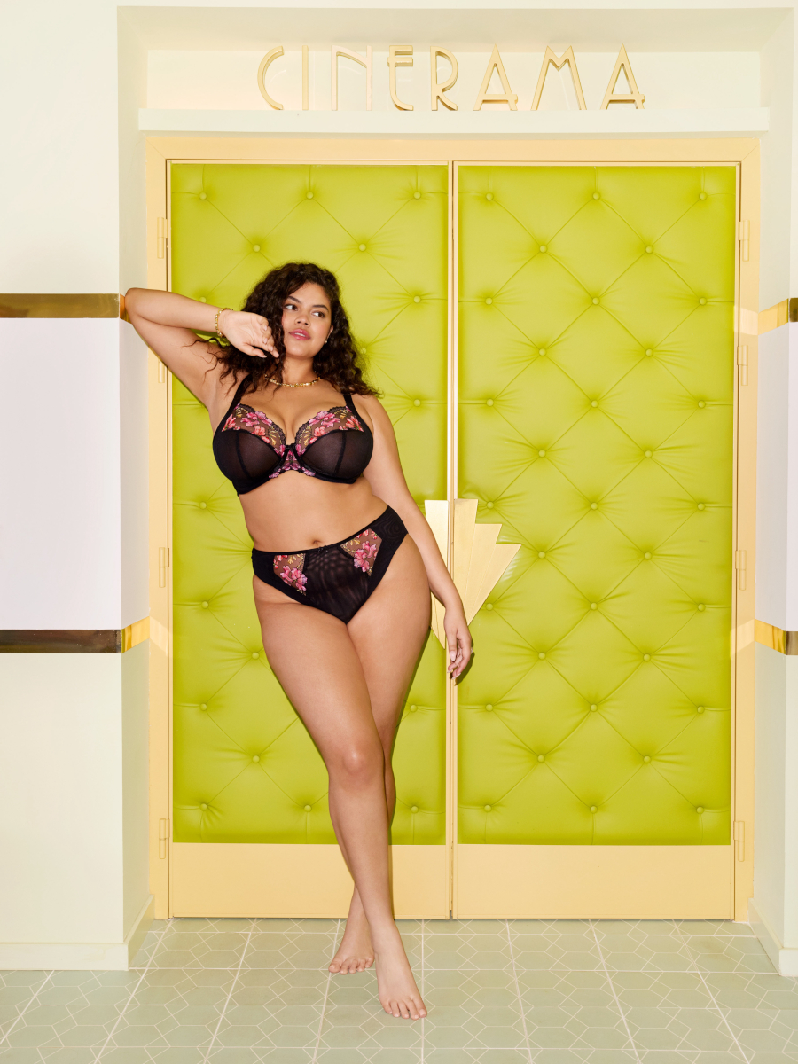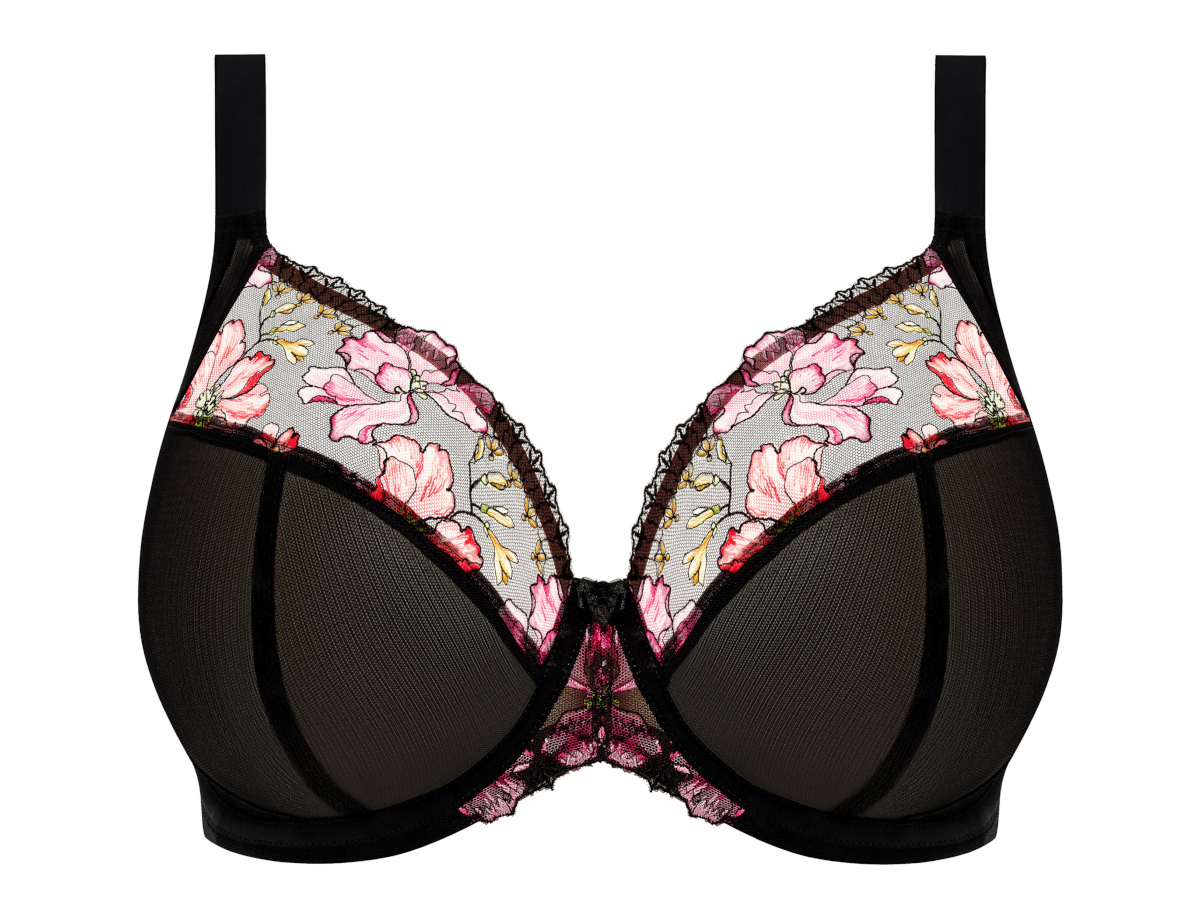 Představujeme podprsenku Elomi Teagan plunge opravdový skvost v černoduhové barevné kombinaci. Košíček je šitý ze čtyř částí s boční podporou, která drží prsa hezky u sebe a nepustí je do boku. Podprsenka prsa krásně pozvedne a vytvaruje dokulata. Tento model má nižší střed, ale přitom netlačí poprsí tolik k sobě jako například push-up modely. Síťovinu na středovém panelu a vrchní část košíčků zdobí květy v barvách duhy od žluté až po fialovou, vytvořené precizně tištěnou výšivkou. Ve středu podprsenky je elegantní mašlička. Zádový díl je podél horní a zadní části lemován elastickým materiálem saténového vzhledu stejně jako spodek košíčku. Nastavitelná ramínka mají také saténový vzhled a jsou navíc ozdobena jemným mini pikotkovým okrajem. Všechny tyto detaily dodávají podprsence luxusní vzhled.