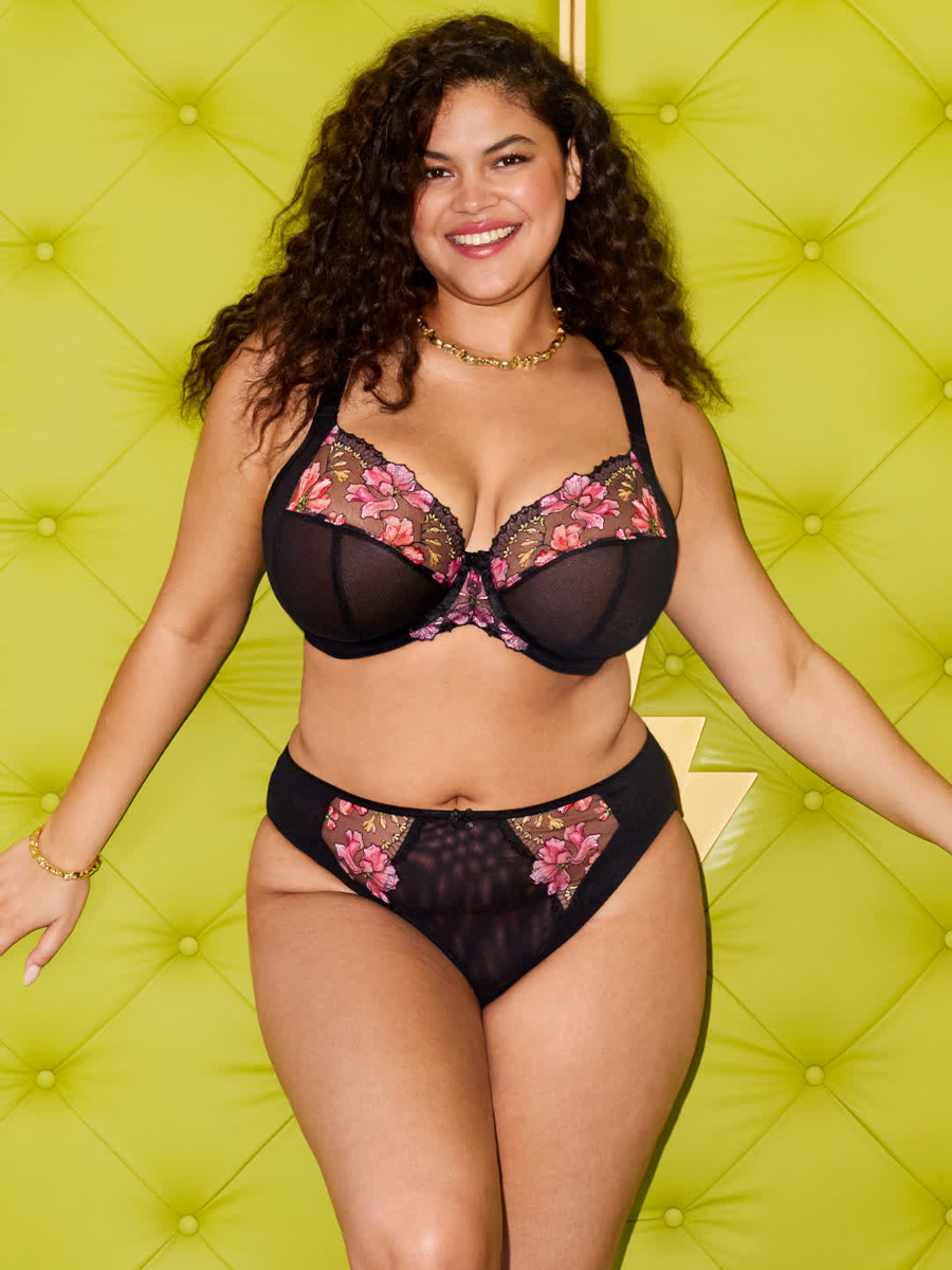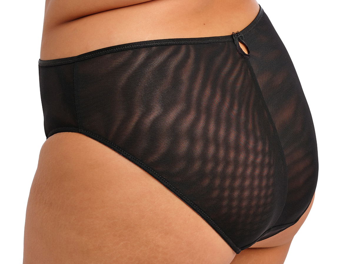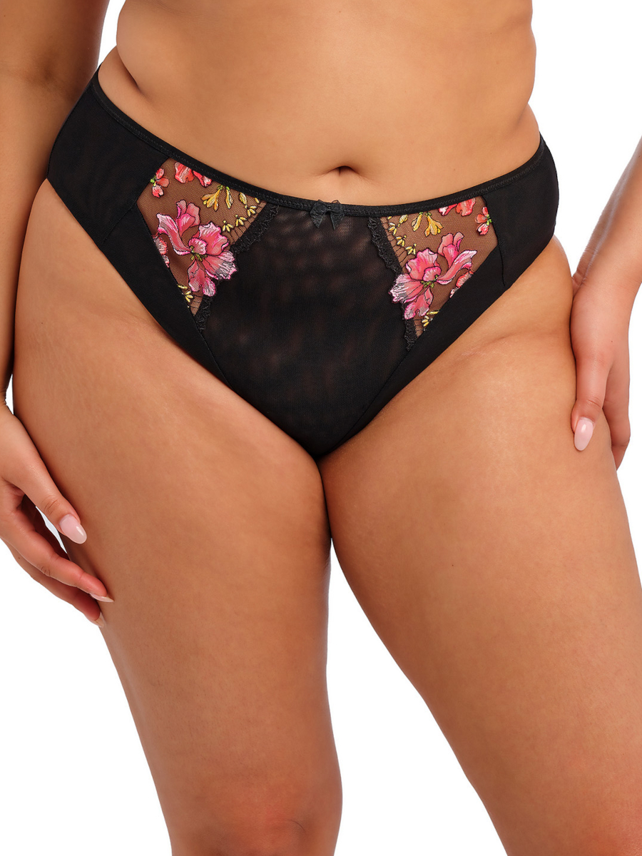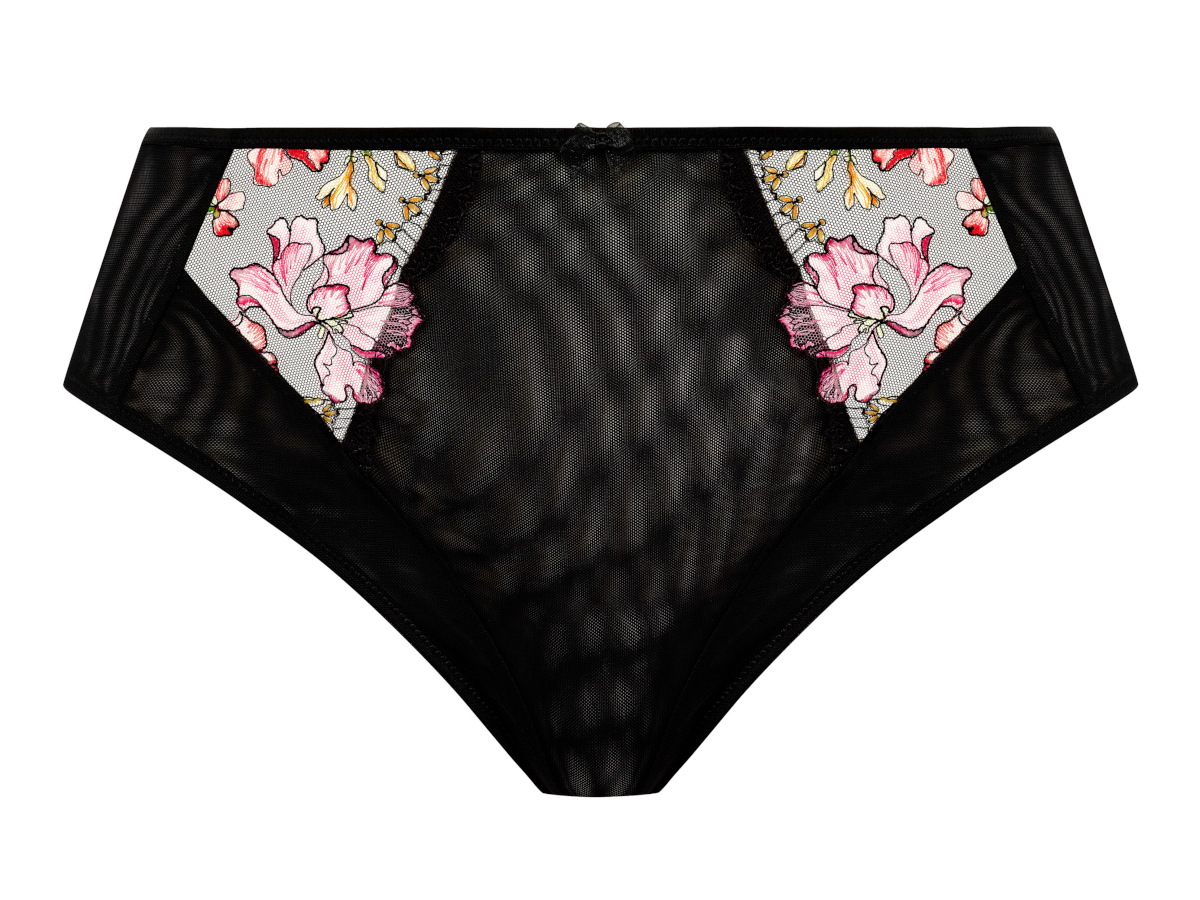 Vyšší kalhotky do kompletu k podprsence Elomi Teagan v černoduhové barevné kombinaci jsou vyrobeny z dvojité vrstvy elastické síťoviny pro perfektní kombinaci krytí a prodyšnosti. Přední díl zaujme průhlednými panely ze síťoviny, které zdobí květy v barvách duhy od žluté až po fialovou, vytvořené precizně tištěnou výšivkou. Ve středu kalhotek je elegantní mašlička. Na bocích jsou více vykrojené a opticky tak prodlouží nohy. Zadní strana kalhotek má středový šev, díky kterému kalhotky lépe obepnou vaše křivky, v horní části je elegantní průstřih ozdobený mašličkou. V klínku je bavlněná podšívka pro maximální komfort.