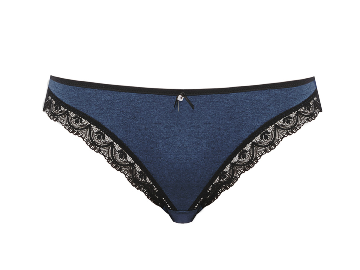 Kalhotky tanga brazilského střihu do kompletu k podprsence Freya Deco Amore. Kalhotky mají krásnou tmavě modrou barvu a zdobí je elegantní černá krajka a mašlička. Střih je velmi lichotivý, zadní část je přes půlku zadečku. Krajka v krajích je příjemná a elastická, v zadní části mírné nařasení, které opticky zakulatí zadeček. Velmi příjemný materiál.