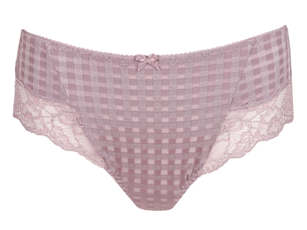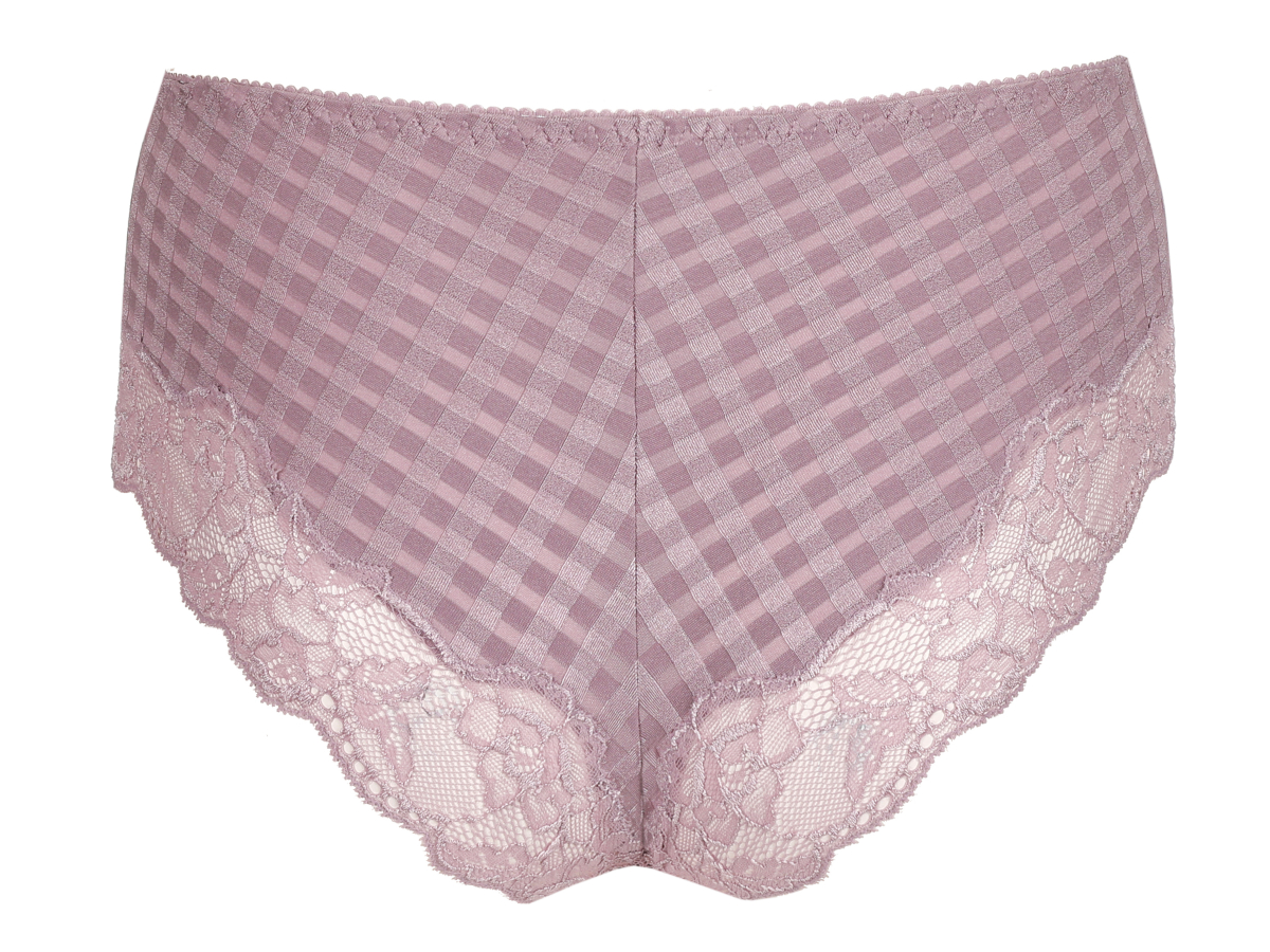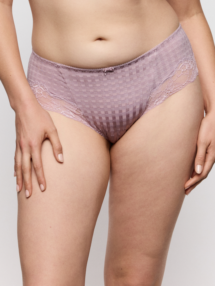 Poloprůhledná krajka a texturované geometrické vzory dohromady vytváří jedinečný model kalhotek PrimaDonna Madison ve světle fialové, elegantní, neutrální barvě. Brazilky jsou na zadečku více vykrojené, vyrobeny z jemného mikrovlákna a měkké elastické krajky. Střih je velice lichotivý. Zadní část kalhotek je neprůhledná zdobená elastikou krajkou.
