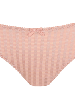 Poloprůhledná krajka s metalickým vláknem a texturované geometrické vzory dohromady vytváří jedinečný model kalhotek PrimaDonna Madison v barvě Powder Rose. Kalhotky jsou klasického střihu, vyrobeny z jemného mikrovlákna a měkké elastické krajky lemující boky kalhotek. V přední části vykrojenější a opticky tak prodlužují nohy. Zadní část kalhotek je neprůhledná zdobená elastikou krajkou.