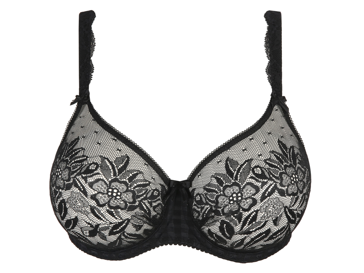 Podprsenka Madison luxusní značky PrimaDonna má bezešvé košíčky v srdíčkovém střihu. Košíčky jsou zdobeny krásnou francouzskou krajkou s květinovým vzorem. Transparentní kraječka dodává podprsence lehký ženský vzhled. Předlisované košíčky poprsí pozvednou a dodají krásný kulatý tvar bez rušivého švu. Ramínka jsou v přední části ozdobeny krajkou a jsou nastavitelná pro pohodlné nošení. V černé barvě ze stálé kolekce.