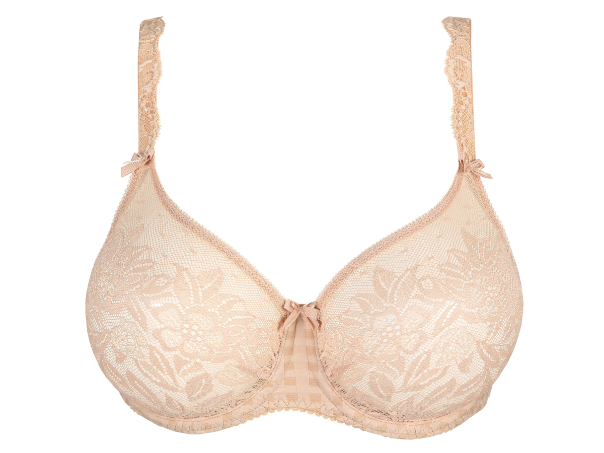 Podprsenka Madison luxusní značky PrimaDonna má bezešvé košíčky v srdíčkovém střihu. Košíčky jsou zdobeny krásnou francouzskou krajkou s květinovým vzorem. Transparentní kraječka dodává podprsence lehký ženský vzhled. Předlisované košíčky poprsí pozvednou a dodají krásný kulatý tvar bez rušivého švu. Ramínka jsou v přední části ozdobeny krajkou a jsou nastavitelná pro pohodlné nošení. V tělové barvě ze stálé kolekce.