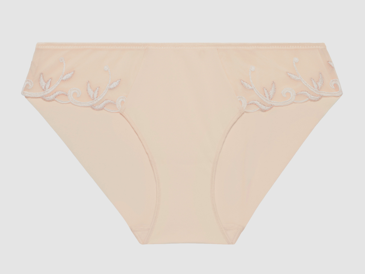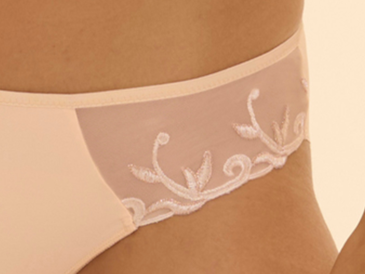 Kalhotky klasického střihu do kompletu k podprsence Simone Perele Andora v limitované béžové barvě s lesklou výšivkou. Kalhotky jsou maximálně příjemné na dotek, boky zdobí tyl s nádhernou francouzskou výšivkou. Okraje jsou zcela tenoučké a hladké, kalhotky se tak nebudou rýsovat ani pod velmi přiléhavými oděvy. Doporučujeme kombinovat s podprsenkou Andora ve stejné barvě.