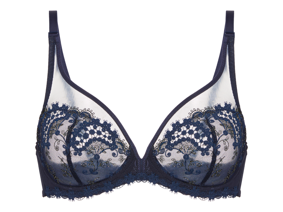 Luxusní kolekce Wish je propracovaná do těch nejmenších detailů, jedná se o krásnou a skutečně ženskou kolekci. Kombinuje výšivku guipure, výšivku na závoji a italský satén Jacquard. Jemná květinová výšivka si navíc pohrává s lesklým a matným propracováním materiálu. Tato nevyztužená podprsenka má velmi lichotivý a funkční střih. Spojuje v sobě nízký střed a vlastnosti tzv. „full cup“ košíčku. Výšivka ve spodní části košíčku evokuje balkonetový rovný střih, ale zároveň přináší pohodlí a jistotu uzavřenější podprsenky. Na těle podprsenka vypadá naprosto skvěle a perfektně sedí. Podprsenka je v limitované krásné tmavě modré barvě s třpytivou stříbrnou výšivkou.